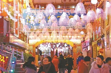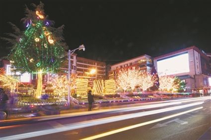 火樹銀花不夜天,流光溢彩呈繽紛?!敖衲甑囊咕罢嫫涟?!”旺姆阿姨和登增叔叔晚飯后帶著孫女來(lái)到將軍橋散步,在自己的家鄉(xiāng)欣賞到如此美妙的景色,登增叔叔忍不住夸贊。此時(shí),將軍橋道路兩旁的綠化帶在彩燈的映襯下輪廓畢現(xiàn),與玻璃棧道上的光影交相輝映,城市美景盡在其中。