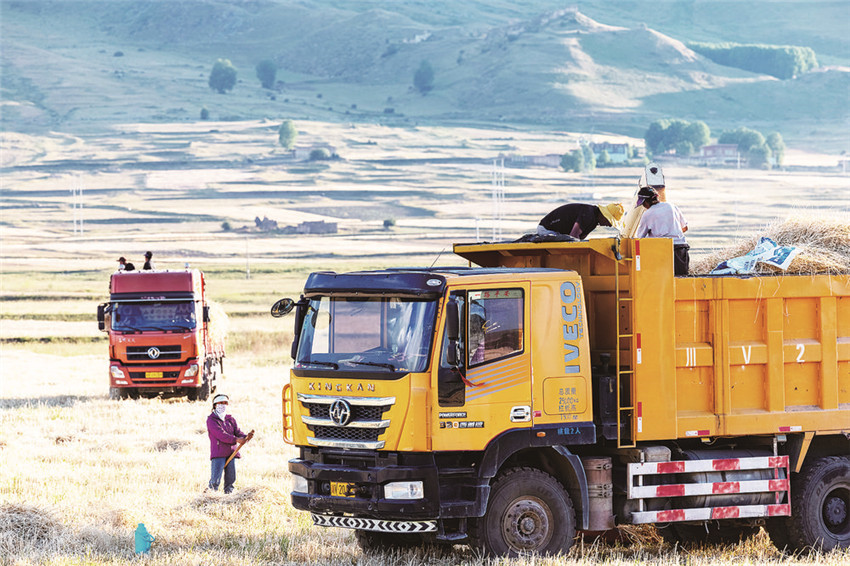 甘孜縣是我州的農(nóng)業(yè)大縣,也是全國(guó)青稞商品糧基地之一,素有“康北糧倉(cāng)”的美譽(yù)。日前,在甘孜縣仁果鄉(xiāng)青稞收割現(xiàn)場(chǎng),一望無(wú)垠的田地里麥浪滾滾、麥香四溢,一臺(tái)臺(tái)聯(lián)合收割機(jī)在金色的青稞地里來(lái)回馳騁,時(shí)不時(shí)停下來(lái)“吐出”金燦燦的青稞,農(nóng)戶們的臉上露出豐收的喜悅笑容。