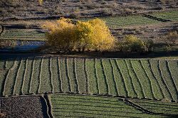 金沙江流經(jīng)四川省巴塘、得榮等縣時,支流眾多,高山峽谷之間形成眾多緩坡和平地,氣候高溫、低濕,干燥晴朗。雖進入初冬,但這里彎彎的河流長流不息、樹木染色、田地漸綠,一片迷人的河谷田園風光。