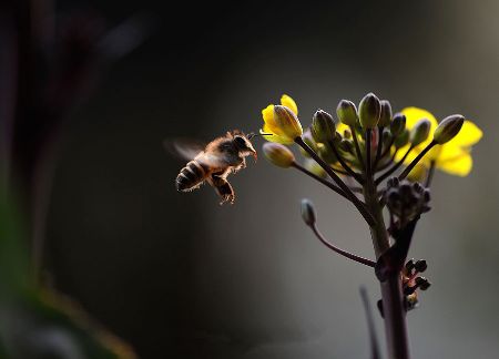 千百年來(lái),許多小宗蔬菜的傳宗接代依靠中華蜜蜂授粉。紫油菜花在初春開(kāi)放,這個(gè)季節(jié)西方蜜蜂因畏寒仍在巢中被人工飼養(yǎng),只有中華蜜蜂不怕寒冷,不嫌花源稀少,只要?dú)鉁剡_(dá)到8℃,它們就出勤了。 熊小立圖文 攝于成都