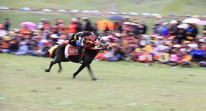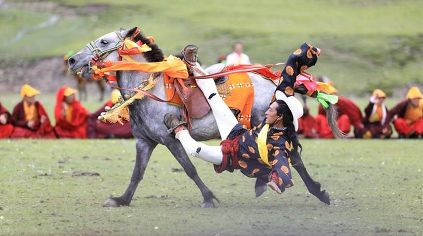 7月23日,四川甘孜藏族自治州理塘縣村戈鄉(xiāng)賽馬活動開始,牧民們在馬背上一顯身手。每年藏歷六月,當(dāng)草原上格?;ㄊ㈤_的時(shí)候,四川省理塘縣24個(gè)鄉(xiāng)(鎮(zhèn))就會按照習(xí)俗舉辦隆重的賽馬會來拜祭神山,慶祝豐收。迄今有400多年歷史的賽馬分為耐力賽、小走賽、馬術(shù)賽等,其中最為精彩的是馬術(shù)賽:馬肚藏身、馬背倒立、飛騎射擊、拾哈達(dá)等,驚險(xiǎn)刺激。2008年6月,此項(xiàng)活動被列入四川省級非物質(zhì)文化遺產(chǎn)保護(hù)項(xiàng)目。(朱虹 葉強(qiáng)平)