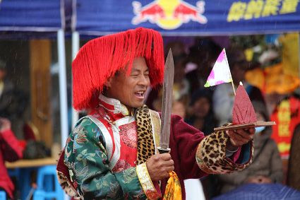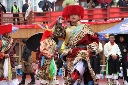 除了歌舞文化,德欽還是民俗文化最大的平臺,神山祭祀是村村寨寨必不可少的活動,在德欽,藏民對山水自然賦予了靈性,認(rèn)為自然也是和人一樣有著生命和靈性,尊重自然演繹出神山祭祀活動豐富多彩?!暗顿潯?藏語稱“百諧”。在德欽農(nóng)村,刀贊是祭祀活動的重頭戲,這一天,不亞于一個盛大的服飾表演。相傳“百諧”是古時村民為消除戰(zhàn)亂,祈福平安的一項傳統(tǒng)祭祀活動,延續(xù)至今已經(jīng)成為一項傳統(tǒng)的民俗活動?!鞍僦C”既是祭祀活動的一個儀式,也是一個獨(dú)立的傳統(tǒng)民俗活動,村里每戶一男丁在這一天必須參加“百諧”?!疤K夏”是村里男人戴的最為隆重的帽子,他不同于金邊帽和狐皮帽。長刀是“刀贊”的道具, “吉祥的日子里,我們一敬天地,賜給我們帶來幸福的生活;再敬尊敬的共產(chǎn)黨,為我們帶來平安吉祥;三敬慈祥的雙親,教會我們?nèi)绾巫鲆粋€好人……”朗朗上口的說詞伴著閃閃的刀光起舞,頗具康巴壯士的英武陽剛。
