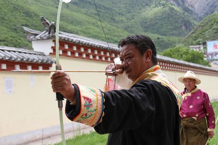 射箭也是德欽以及周邊些村落的重要民俗活動之一,村里的男人們盛裝出場,在射箭場彎弓搭箭,從7、8歲小孩到50多歲的老人都要參加射箭,甭管你射得中靶子與否,笑聲里充滿了和諧和喜慶。德欽縣的江坡村,在每年桃花盛開的季節(jié),都要開展盛大的射箭節(jié),全縣的射箭愛好者都前來一顯身手,康巴漢子們不僅射得一手好箭,還得會拉弦子,悠揚(yáng)的弦子聲可以給射手們加不少分,活動的初衷就是要求藏族男人必須能文能武。弦子聲聲,唱出了藏家百姓美好的生活,村里的女人戴上了各種金銀首飾,男人們手拉弦子,盡情歡暢的唱著、跳著,村里的老人們是忠實的觀眾,看著大家在舞場里的步子,他們也跟著笑得合不攏嘴,有些年輕人還不時跑出舞場到場邊的老人們面前請教弦子的唱詞,老人們總是不厭其煩的傾囊相授,因為他們曾經(jīng)也是弦子舞場的“明星”。
