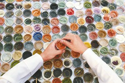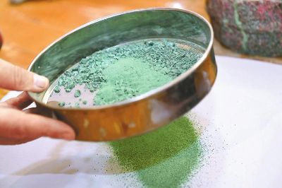 傳統(tǒng)的唐卡是藏族文化中一種獨具特色的繪畫藝術形式,需經繃布、打磨、定位、起稿、涂色、暈染、拉線條、拉金線等多種程序,天然原料作色保證了畫作幾百年后色澤還依然鮮艷。在著著的畫室里,擺放了百個裝滿各色礦物質顏料的調色小碗,“上色用的是延續(xù)千年的礦物研磨顏料?!睘榱俗岊伭献魃鶆?,著著還用自己的辦法搞出了專用的顏料攪拌機。