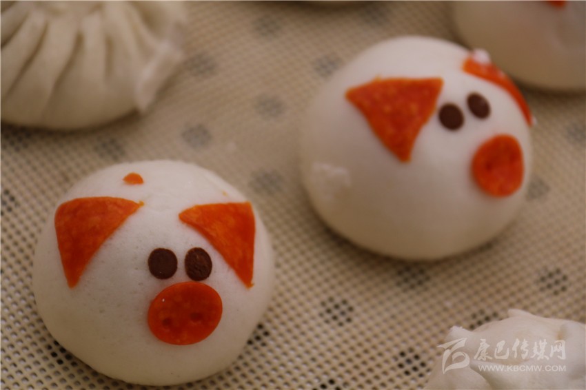 “這個(gè)包子也長(zhǎng)得太可愛了吧!”記者順著旁邊的驚呼聲看去,五歲的肖紅拿著一個(gè)做成小豬樣的包子對(duì)著她奶奶說。趕緊走近店里,記者也來了份兒奶黃餡兒的卡通小豬包子,一口咬下,奶黃順著缺了的口子流出來,趕緊吸了一口,甜甜的味道瞬間在舌尖化開。為了滿足記者的好奇心,老板介紹說:“將面團(tuán)捏好搟薄,再包入餡,收口朝下,像包包子那樣捏好口,捏出有點(diǎn)像豬的型狀,再撕一點(diǎn)黃色面團(tuán)做個(gè)豬鼻子,用一根筷子按下去成兩個(gè)鼻孔,再捏兩只耳朵和一根尾巴,準(zhǔn)備些黑芝麻,做眼晴,拿根筷子點(diǎn)點(diǎn)水沾一個(gè)芝麻放在豬身上,可愛的卡通小豬包就做好了?!钡赇伹皵D滿了小朋友,老板告訴記者:“這種卡通包子之所以受小朋友的喜歡不僅是因?yàn)槠淇蓯鄣目ㄍㄍ獗?,而且我們所有的卡通包子餡兒都是甜的。我們精準(zhǔn)定位,投孩子們所好,取得的成效還不錯(cuò)。這次來參加美食節(jié),只帶來了小豬和刺猬兩種卡通形象的包子,賣得挺好,準(zhǔn)備在接下來的幾天將小猴子等卡通形象的包子也帶過來。”