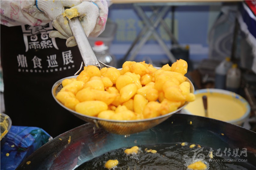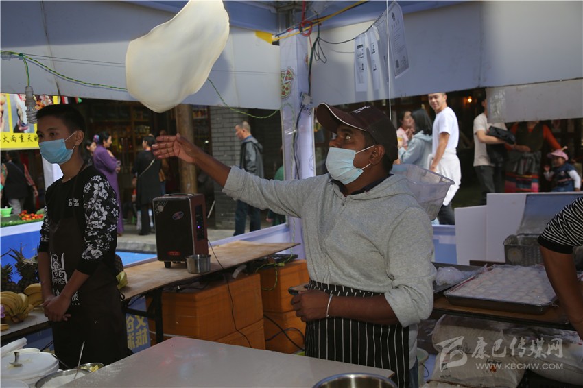 要說美食節(jié)最炫酷的店鋪,那非“印度飛餅”莫屬了。記者穿過層層圍觀的人群,點(diǎn)了一份菠蘿飛餅。只見廚師將捏好的面團(tuán)在案板上揉了幾下,便捏緊面餅一端按順時(shí)針方向轉(zhuǎn)動(dòng),手里的面餅越轉(zhuǎn)越大,越轉(zhuǎn)越薄,幾近透明,接著就是放餡料,稍做煎炸,切割裝盤,短短一分鐘內(nèi),一氣呵成。記者接過盤,咬下一口,“喀嚓”一聲,再一口就吃到了菠蘿的清香,外層淺黃松脆,內(nèi)層綿軟白皙,略帶甜味,好一個(gè)外脆內(nèi)嫩?。〗榔饋韺哟呜S富,一軟一脆,口感對(duì)比強(qiáng)烈,嚼過之后,齒頰留芳。當(dāng)脆餅撞上菠蘿的清香,就像在夏天突然掉進(jìn)一個(gè)水池,清爽又驚喜?!案杏X就是一件的藝術(shù)品啊!”如此的驚嘆聲從人群中迸發(fā)出來。