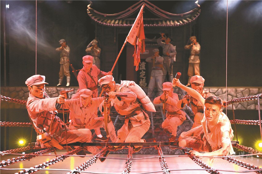本網(wǎng)訊 在身著紅軍服、打著“火把”的戰(zhàn)士的引領(lǐng)下,觀眾緩緩而行,在經(jīng)歷一場激烈的戰(zhàn)斗后,大家走過銷煙彌漫的戰(zhàn)場,來到實景劇場,以一位“親歷者”的身份“穿越”至歷史的場景。幽深的河谷、洶涌的波濤、兇殘的敵人、英勇的戰(zhàn)士、激烈的戰(zhàn)斗……隨著劇情的展開,讓人親臨其境84年前那場驚天動地的重要戰(zhàn)役——《飛奪瀘定橋》。