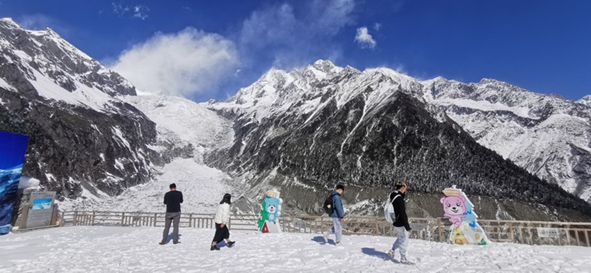 “前天從網(wǎng)上看到海螺溝景區(qū)即將開放的信息,別提多帶勁兒了。這次疫情發(fā)生就一直在家呆著,悶太久了,就想著疫情可控可防的時候,一定要來川西走走,剛好海螺溝離成都車程近,網(wǎng)絡(luò)風評也是有口皆碑的?!边h道而來的寧波游客吳先生目之所及盡是玉樹瓊枝、銀裝素裹的雪原冰川風光,激動不已地說:“透透氣、玩玩雪、泡泡湯,回歸自然的感覺真太好了!”