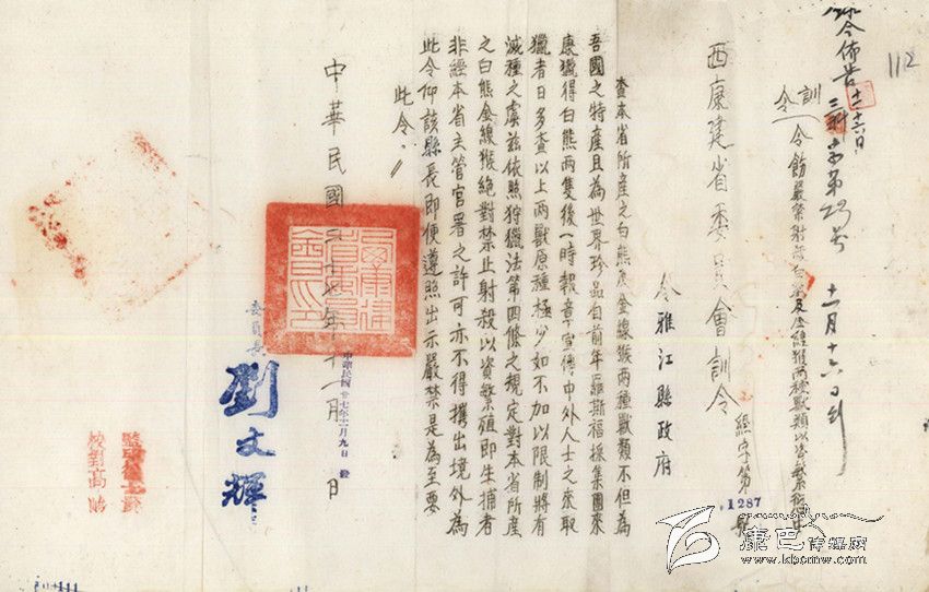 民國27年(公元1938年),“西康省建省委員會(huì)”發(fā)出“經(jīng)字第1287號”訓(xùn)令,這是一份難能可貴的保護(hù)野生動(dòng)物的訓(xùn)令,訓(xùn)令說:“查本省所產(chǎn)之白熊及金線猴兩種獸類,不但為吾國之特產(chǎn),且為世界珍品。自前年羅斯福采集團(tuán)來康獵得白熊兩只后,一時(shí)報(bào)章宣傳,中外人士之來取獵者日多。查以上兩獸原種極少,如不加以限制,將有滅種之虞。茲依照狩獵法第四條之規(guī)定,對本省所產(chǎn)之白熊、金線猴絕對禁止射殺,以資繁殖。即生捕者非經(jīng)本省主管官署之許可,不得帶出境外。為此令仰該縣長即便遵照出示嚴(yán)禁是為至要,此令。”訓(xùn)令最后署有“西康建省委員會(huì)委員長劉文輝”的簽名。