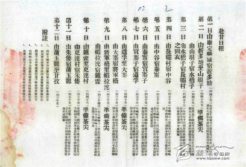 為了安排好戴院長(zhǎng)一行的行程,西康建省委員會(huì)專門發(fā)出了一份“訓(xùn)令”。這份時(shí)間表就是根據(jù)“訓(xùn)令”要求為戴院長(zhǎng)行程作出的安排。每天從何地到達(dá)何地,里程多少,休息地有無(wú)村莊、寺廟,接待力量如何、是進(jìn)房屋休息還是支帳篷都有說(shuō)明,而且對(duì)沿途各縣各地提出了包括應(yīng)準(zhǔn)備柴草、應(yīng)在哪些地方準(zhǔn)備“打尖茶”(午飯)等具體要求。