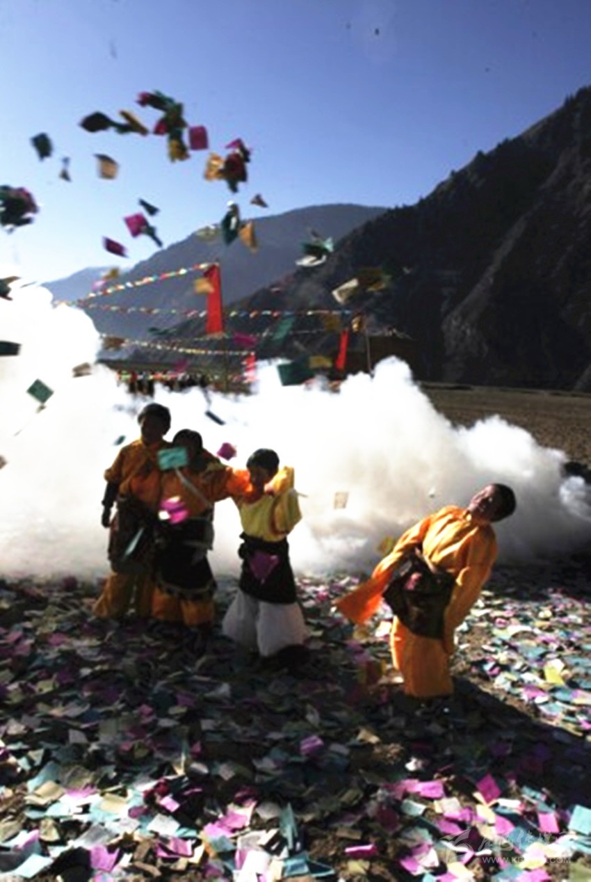 正午時(shí)分,村里的小伙子身著節(jié)日盛裝,手持木刀、木劍,肩扛松星到神山去祭山神,將木刀、木劍和松星插在神塔上,他們認(rèn)為這樣做就可以全副武裝山神了,任何妖魔鬼怪都不敢來(lái)侵?jǐn)_村莊了。小伙子們?cè)谏袼赃咟c(diǎn)燃柏枝,撒上青稞酒、糌粑、酥油、茶葉、大米等,然后圍著白塔轉(zhuǎn)經(jīng),呼喚著各種動(dòng)物的名字,喇嘛在一旁齊聲祈福。新龍人特別注重過(guò)十三節(jié),所有讓人興奮的娛樂(lè)活動(dòng)都會(huì)在十三這天下午在村子里隆重上演,村民不僅是各種娛樂(lè)活動(dòng)的參與者,更是最忠實(shí)的觀看者。