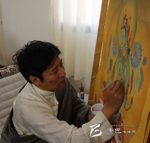 “如此工藝精細(xì)、筆法工整的繪制過程,必然注定價(jià)值的與眾不同。”記者話音未落,他便迫不及待地加以了例證:“比如,要繪制一幅長(zhǎng)1.25米、寬1米的‘多派唐卡’,需要有近百個(gè)佛像,最小的佛像頭部只有指甲蓋大小,筆觸要求非常細(xì)膩,哪怕每天都堅(jiān)持畫十幾個(gè)小時(shí),至少也要一年多時(shí)間來(lái)才能完成。由于題材從宗教轉(zhuǎn)向世俗、審美從傳統(tǒng)走向現(xiàn)代、技法從圖像制作走向藝術(shù)創(chuàng)造,唐卡作為‘藏密文化’的概念正逐漸被世人所知,并成為唐卡藝術(shù)品市場(chǎng)上的寵兒。2012年3月18日,我和一級(jí)唐卡畫師丁嘎創(chuàng)作的《五度母像》長(zhǎng)幅唐卡以168萬(wàn)元的高價(jià)被收藏者購(gòu)買,創(chuàng)下了‘多派唐卡’最高售價(jià)紀(jì)錄,‘多派唐卡’也因此成了公眾與輿論關(guān)注的熱點(diǎn)和焦點(diǎn)。”