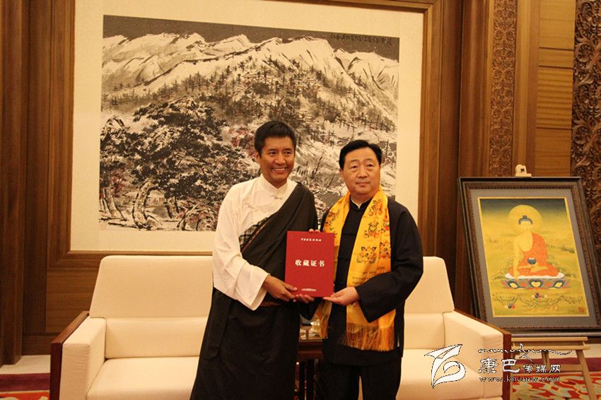 產(chǎn)業(yè)化發(fā)展的探索之路,不僅圓了年敘·多吉頓珠的“文化產(chǎn)業(yè)夢(mèng)”,而且也讓他實(shí)現(xiàn)了一次華麗轉(zhuǎn)身,成為一名有擔(dān)當(dāng)?shù)钠髽I(yè)家。今年9月5日至15日,由中華文化發(fā)展促進(jìn)會(huì)、西藏自治區(qū)文化廳、西藏自治區(qū)文學(xué)藝術(shù)界聯(lián)合會(huì)、西藏自治區(qū)文化產(chǎn)業(yè)協(xié)會(huì)主辦,西藏崗地文化產(chǎn)業(yè)集團(tuán)、西藏拉姆拉綽唐卡畫院承辦的“西藏唐卡藝術(shù)——多吉頓珠、丁噶唐卡作品展“在北京中國(guó)國(guó)家博物館舉行。他和丁嘎先生現(xiàn)場(chǎng)向國(guó)家博物館捐贈(zèng)了《釋迦牟尼》、《五方度母》、《綠度母》和《觀音》四幅精品,這是國(guó)家博物館首次收藏多派唐卡和嘎瑪嘎智畫派唐卡,填補(bǔ)了國(guó)家博物館館藏嘎瑪嘎止畫派和多派唐卡的空白。國(guó)家博物館館長(zhǎng)呂章申先生熱情為兩位大師頒發(fā)了收藏證書并激動(dòng)地說:“多吉頓珠先生和丁嘎先生捐贈(zèng)的精品力作,豐富了中國(guó)國(guó)家博物館的館藏,更好地弘揚(yáng)了西藏文化藝術(shù)。國(guó)家博物館有責(zé)任把最好的藝術(shù)品收藏起來(lái),留存于后世。”