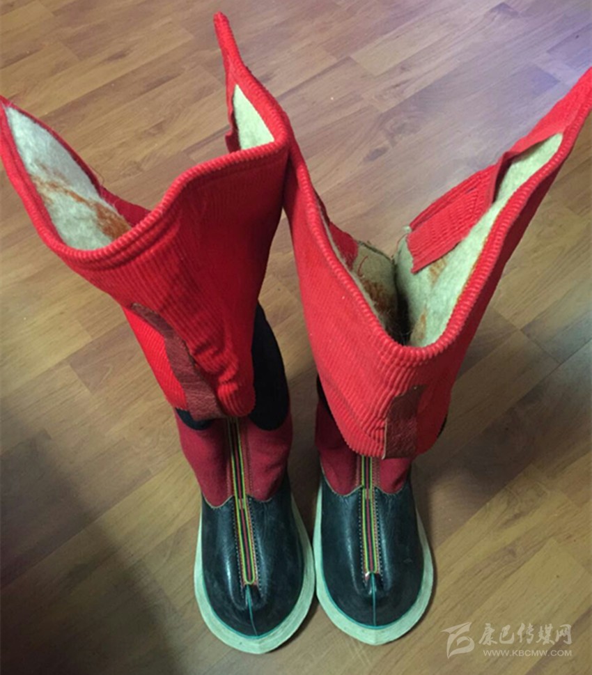 藏靴,是藏民不可缺少的用品,靴子的原料為牛皮,用較厚的牛皮作底,薄一點(diǎn)的作面,底和面的縫合則用牛羊皮條,鞋口前端還有帶毛的牛羊皮裝飾。從外觀上看類似舞臺(tái)上古裝戲里將相穿的靴子,靴子內(nèi)里有毛絨,既暖和又舒適,鞋腰還配有由氆氌等原料制成的各類樣式的線條、花紋。
