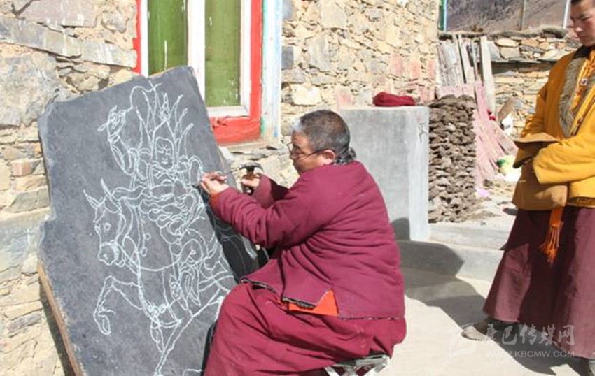 道孚縣東部的龍燈壩曾是格薩爾王征戰(zhàn)過(guò)的地方,這里以“格薩爾通”為核心的格薩爾文化世代流傳、積淀深厚,且富有質(zhì)地堅(jiān)硬、品相良好的天然頁(yè)巖。在歲月的長(zhǎng)河中,龍燈人把傳統(tǒng)繪畫、歷史傳說(shuō)和石刻工藝緊密融合,創(chuàng)造了獨(dú)具特色的龍燈石刻,填補(bǔ)了格薩爾文化在藏族石刻中的空白。千百年來(lái),龍燈人像傳承基因一樣世代傳承著這門“專屬”工藝。