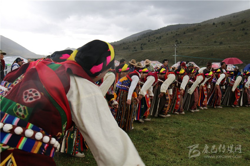10月2日,在木雅鍋莊悠揚(yáng)的旋律和輕盈的舞步中,歷時兩天的“2017康定情歌國際音樂節(jié)”盛大開幕,作為“五大民俗展演”中的特色民俗歌舞表演部分,木雅鍋莊吸引了眾多游客的關(guān)注。木雅鍋莊來源于木雅人的日常生產(chǎn)和生活,是當(dāng)?shù)剞r(nóng)耕文化習(xí)俗的重要表現(xiàn),表演服飾多以棕紅色外套,紅、白色襯衫為主,表演者多佩戴紅頭繩、珊瑚、金銀等裝飾物。舞蹈分男女兩組,列隊圍桌成圓形,皆彎腰垂首隨領(lǐng)唱歌聲而舞。男組舞姿氣勢豪放,女組舞姿委婉優(yōu)雅。唱腔宛轉(zhuǎn)悠揚(yáng),吸引了在場觀眾冒雨駐足觀看,有的甚至情不自禁隨著舞群踏起了舞步,融入到康巴文化的神秘魅力當(dāng)中。