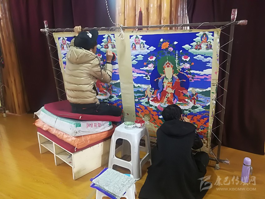 今年初秋,在爐霍縣郎卡杰唐卡演展中心門外場地上,三位學(xué)生正在打磨用牛膠和礦物粉浸潤后晾干的畫布,他們將畫布平鋪在木板上,用倒扣的瓷碗一遍遍仔細(xì)地磨著。這是繪制唐卡的最初階段,也是爐霍縣唐卡協(xié)會(huì)專門為廣東媒體甘孜文化行記者安排的觀摩節(jié)目,讓大家迅即有零距離接觸唐卡的感覺。爐霍縣文化館館長、郎卡杰唐卡繪畫藝術(shù)協(xié)會(huì)會(huì)長雍珠洛吾由此開始,一步步帶我們走進(jìn)唐卡制作和郎卡杰唐卡藝術(shù)的世界。
