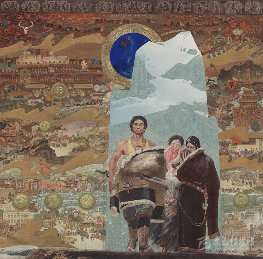 15世紀以來,唐卡發(fā)展所恒定的兩個元素:一是平面構圖的神佛之境,另一則是吸收大青綠山水精髓。正如DNA鏈的雙螺旋結(jié)構一般,使唐卡繪畫在歷史時空中穿插縈繞,在雪域各地生根開花。到了公元20世紀初,照片的高度寫實促使藏地畫家邁出了革新步伐,使得唐卡繪畫逐漸擺脫傳統(tǒng)束縛,開啟了“人”的覺醒。衛(wèi)藏地區(qū)出現(xiàn)了“根敦群培、安多強巴”引入寫實主義的嘗試,成為當今西藏“布面重彩”的先驅(qū)。新中國成立后,內(nèi)地的美術創(chuàng)作積極影響了三大藏區(qū)的繪畫發(fā)展,上世紀80年代,四川康區(qū)“甘孜藏畫”肇起,在《嶺·格薩爾王》人文主義的召喚下,《雪山兒女》《唐東杰布》《新概念唐卡》正從歷史深處一路走來。而近年來,安多藏區(qū)則創(chuàng)新出了“藏族祥巴版畫”,祥巴版畫不僅是從材料技法上對西藏繪畫的豐富,更是藏地畫家們在自覺不自覺的求新、求變;甚至在傳統(tǒng)唐卡領域,民間畫師也都在紛紛嘗試將傳統(tǒng)唐卡和現(xiàn)代審美相結(jié)合。這一切,正是唐卡繪畫從傳統(tǒng)走向現(xiàn)代、由宗教博衍至生活的演變過程,在這個過程里,藏地畫家不僅在畫面的形式和語言上完成了傳統(tǒng)與當代的統(tǒng)一,還將西藏的審美特質(zhì)虹化為作品的精神內(nèi)核。這也是唐卡藝術第二次“從香巴拉到人間”的過程,成為民族文化發(fā)展的新坐標。