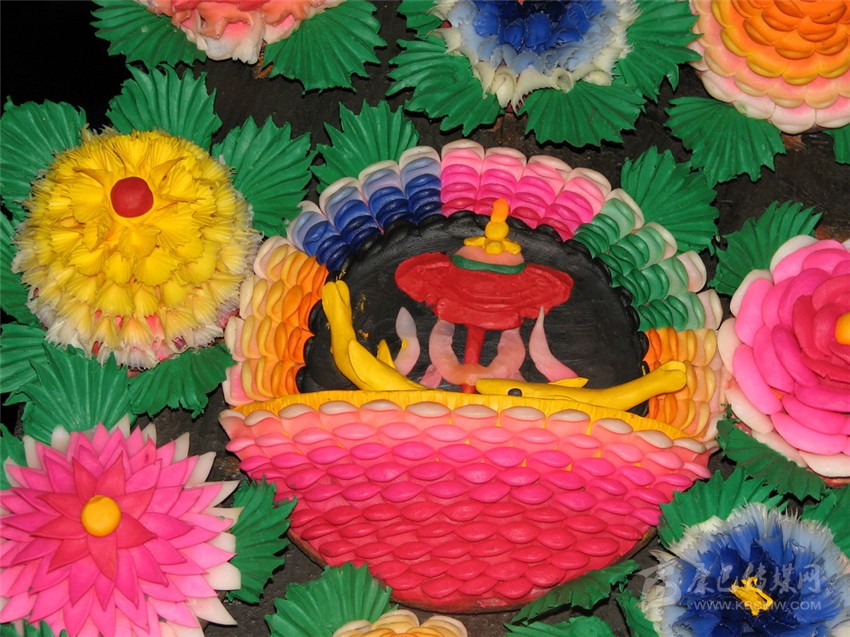 制作酥油花先是“扎骨架”根據所表現(xiàn)的內容,用加工的柔軟草束、麻繩、竹竿、棍子等物扎成大大小小不同形態(tài)的“骨架”,即所塑造的基本模型。其次是“做胚胎”,塑造的第一道原料是用上年拆下來的陳舊酥油花摻和上草木灰反復捶打,制成韌性好彈性強的黑色塑造油泥。然后裹在骨架上完成粗糙但準確的一個個大造型,其塑法近似面塑或泥塑。再次是“敷塑”,塑造的第二道原料是在加工成膏狀的乳白色酥油中揉進各色礦物質顏料,調和成五顏六色的油塑原料,仔細的涂塑在做好的形體上,有的還要用金、銀粉勾勒,完成各色形象的塑造。要是塑造紅花綠葉,或是玲瓏剔透的玉石寶玩,則直接用彩色油料一次塑成。為了防止塑制中因手的溫度而使酥油胚料融化變形,藝僧們在室溫控制在零度的作坊里,身邊放有一個盛有冰塊的水盆,他們要不時將手浸入冰水中。整個制作過程十分艱辛,藝僧們的手上大多會生出凍瘡。對佛教的虔誠和對藝術至美的追求,完全超越了肉體上的痛苦,冰冷的手中,艷麗的酥油花不斷生成。最后酥油花一道工序是“裝盤”,將塑好的酥油花按設計的總圖要求,用鐵絲一一安裝到位,固定在幾塊大木板上或特制的盆內,高低錯落有致,件件立體懸空,觀賞者可以從不同的角度觀瞻玩味。布局成單一的花卉圖案或整幅的故事畫面,俗稱“酥油花架”,展出時,“酥油花架”會用高桿立起,最高可達十幾米,人們在下以仰視角度觀看,更覺佛法莊嚴,寶像生輝。一座大的花架上,往往要塑造幾十個、甚至一二百個人物組成的故事畫面。其中菩薩金剛端坐安詳,飛天仙女身姿綽約,花鳥蟲魚栩栩如生,人物神形兼?zhèn)?,亭臺樓閣金碧輝煌,整個畫面繁而不亂,絢麗多彩,令人嘆為觀止。