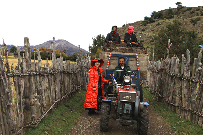 不久雨停下來(lái),山邊露出一縷陽(yáng)光,天空又是一片碧藍(lán)。我們趕緊繞道藍(lán)湖驛站后面的牧場(chǎng)上,發(fā)現(xiàn)一座臨時(shí)搭建的軍用鐵橋可是通向一個(gè)小島。走過(guò)去,島上景色更美,遠(yuǎn)處雪山冰川倒影晶瑩碧藍(lán)的水中,近處綠樹(shù)滿(mǎn)山,草場(chǎng)上牛羊星星點(diǎn)點(diǎn)。島上的小村莊叫阿日村,住著十幾戶(hù)人家,青稞剛收獲完畢,男人正忙著把牛羊過(guò)冬的草料堆積在高高的木架子上,女人除了撿牛糞外,還要準(zhǔn)備冬天取暖的柴薪。雖然村民大多不能講漢語(yǔ),但對(duì)陌生人通常會(huì)含笑致意,一個(gè)小伙子還用結(jié)結(jié)巴巴的漢語(yǔ)重復(fù)了兩遍“喝不,青稞酒?”。我們到村民達(dá)娃卓瑪家,她是家里四個(gè)孩子中的老大,今年二十二歲,最小的弟弟不到五歲。她上過(guò)三年小學(xué),能講一點(diǎn)漢語(yǔ),臨時(shí)充當(dāng)家人的翻譯。父母和奶奶見(jiàn)有客人來(lái),非常熱情,立馬打酥油茶,并端上一盤(pán)奶渣,因?yàn)椴粫?huì)講漢語(yǔ),只好不停招呼我們“吃,多吃”。家里的客堂兼經(jīng)堂寬敞干凈,廊柱和供案施以彩繪,供案上擺放兩個(gè)活佛的一尺見(jiàn)方的照片,前排供了酥油燈、糌粑和清水。