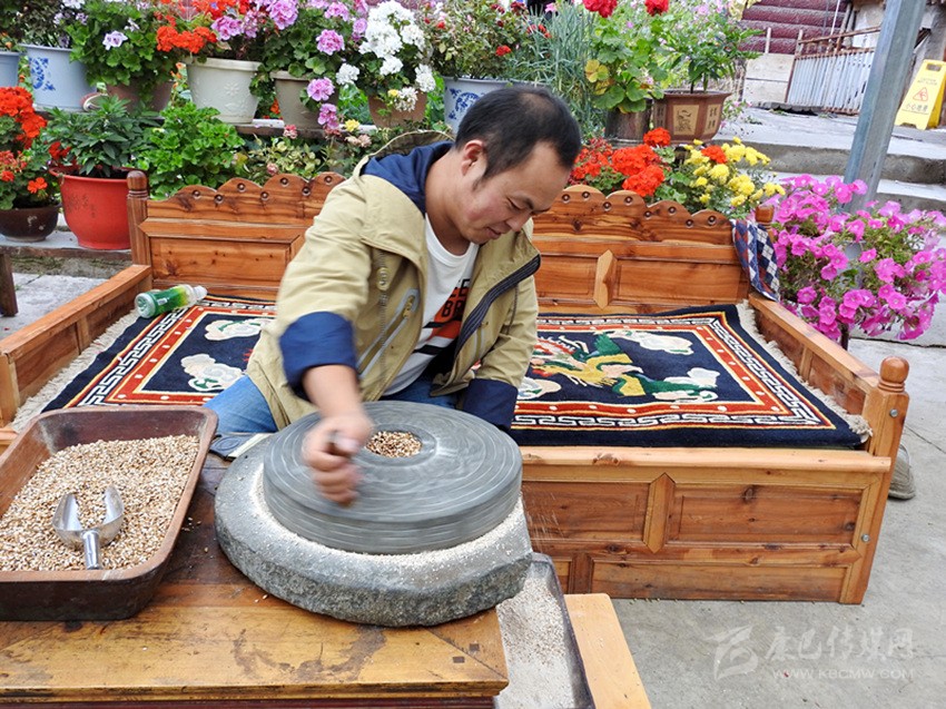 扎呷介紹說(shuō):水淘糌粑的制作工藝非常講究,分四步。首先要選用優(yōu)質(zhì)青稞風(fēng)干篩好,放入山泉水中洗凈、曬干,再用熱水淘洗,瀝干水分趁熱裝人麻袋密封,保持恒溫,放上一夜。第二天,燒熱平底大炒鍋,揭開(kāi)麻袋自然會(huì)聞到一股酒香味,然后倒人炒鍋,不停翻炒。炒青稞關(guān)鍵要掌握好火候,不焦不生,出現(xiàn)青裸花后就炒好了。待炒好的青稞冷卻后,裝入皮口袋,送到磨房,經(jīng)水磨磨出的糌粑,粉細(xì)、色澤潔白、味香可口。