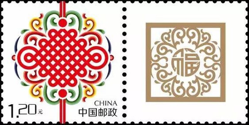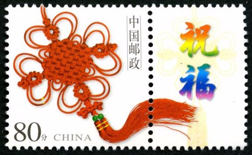 2002年5月10日,中國(guó)郵政發(fā)行《如意》個(gè)性化服務(wù)專用郵票一枚。主票圖案為如意柄端系著一個(gè)紅色“中國(guó)結(jié)”,附票有“祝?!倍?; 2003年3月3日,中國(guó)郵政發(fā)行《同心結(jié)》個(gè)性化服務(wù)專用郵票一枚。主票圖案為盤(pán)長(zhǎng)結(jié)4邊編織有心型繩結(jié)的同心結(jié),附票為“祝?!倍郑?006年9月25日,中國(guó)郵政發(fā)行《中華全國(guó)歸國(guó)華僑聯(lián)合會(huì)成立五十周年》紀(jì)念郵票一枚。圖案為阿拉伯?dāng)?shù)字“5”與中華全國(guó)歸國(guó)華僑聯(lián)合會(huì)圓形會(huì)徽組成數(shù)字“50”,象征全國(guó)僑聯(lián)五十周年,背景畫(huà)面為淡淡的粉紅色“中國(guó)結(jié)”。寓意歸國(guó)華僑與全國(guó)人民血肉相連,同心同德共同建設(shè)美好家園;2013年8月8日,中國(guó)郵政發(fā)行一枚《美好祝福》賀卡專用郵票,圖案為象征喜慶的紅色“中國(guó)結(jié)”;2014年9月20日,中國(guó)郵政發(fā)行《中國(guó)夢(mèng)(二)——民族振興》特種郵票,其中第四枚“民族團(tuán)結(jié)”,圖案中載歌載舞的各民族群眾上方有一個(gè)大紅的“中國(guó)結(jié)”,象征著各民族大團(tuán)結(jié)。