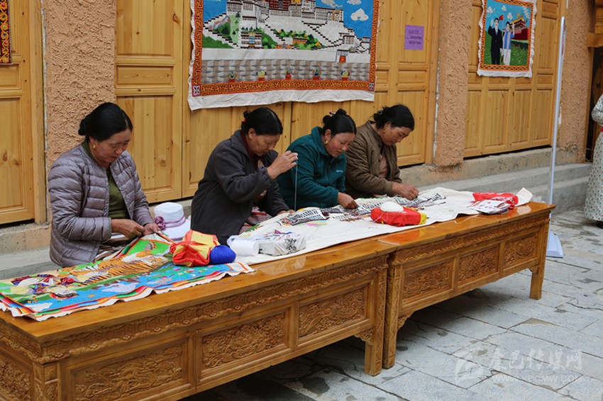 在藏繡展點,5名農(nóng)牧民婦女正在合繡一幅藏族建筑刺繡作品?!拔覐?6歲開始跟著父親學藏繡,傳到我這已經(jīng)是第四代了。除了‘六長壽’、度母像等傳統(tǒng)圖案,今年是新中國成立70周年,我還繡了一幅天安門作品?!?7歲的傳承人達打介紹道。
