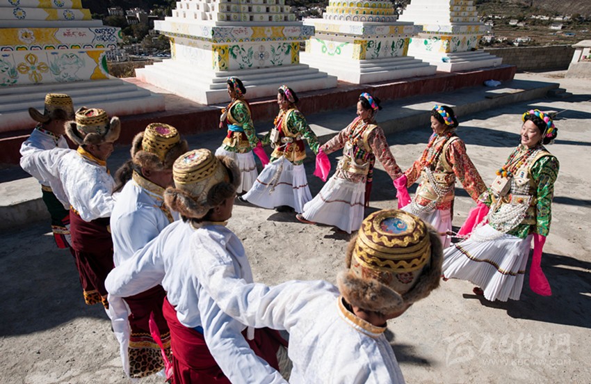這當(dāng)中最具有依憑的觀點(diǎn)是:“學(xué)羌”是藏族傳說(shuō)人物江根阿坡創(chuàng)作的,他綜合了康巴三江沿岸的鍋莊與踏歌的舞步,又融入了滇西北少數(shù)民族的一些舞蹈元素。從歷史上看,得榮瓦卡(茶馬古道金沙江碼頭)曾是茶馬古道上的一座重鎮(zhèn),各民族的馬幫和商人曾集聚在瓦卡碼頭?;蛟S,人們常常在這里載歌載舞,久而久之,在碰撞和交流中慢慢融合出了一個(gè)新的舞蹈:學(xué)羌。