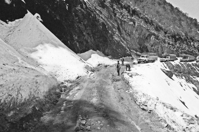 也就是在這一年,我們幾經(jīng)周折,終于聯(lián)系到了遠(yuǎn)在北京的翟新莉女士。當(dāng)年修筑二郞山公路時(shí),翟女士的父親翟壽亭時(shí)任162團(tuán)政委,既是指揮者,也是親歷者。聽(tīng)過(guò)自我介紹,素未謀面、素昧平生的翟女士爽快答應(yīng),積極支持,不僅寄來(lái)《從豫皖蘇到康藏高原》一書(shū),還發(fā)來(lái)了父親留下的一組珍貴照片。照片上,齊腰深的大雪讓人不寒而栗,四面透風(fēng)的工棚使人倍感覺(jué)艱辛。心懷敬仰的閱讀中,一座座大山撲面而來(lái),二郞山、折多山、雀兒山上,戰(zhàn)天斗地的故事驚天地泣鬼神。