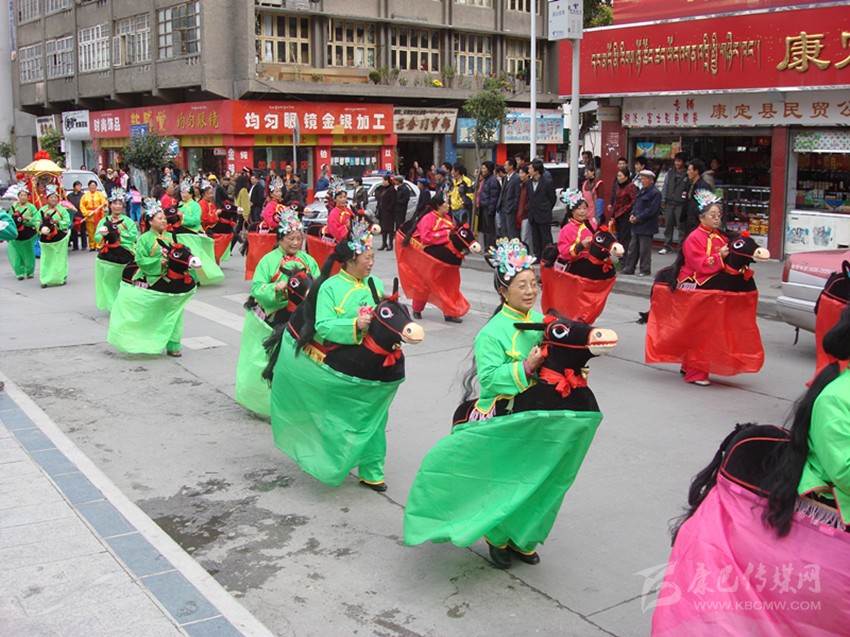 半個(gè)世紀(jì)風(fēng)靡康定城的“船燈”、“馬馬燈”、“鬧山鼓”、“扭秧歌”、“笑頭和尚戲柳翠”、“霸王鞭”……整個(gè)兒就像老陜過年時(shí)的“社戲”場(chǎng)面。大年初一、十五夜“出燈”游街,熱鬧氣氛把整個(gè)年節(jié)塞得滿滿的。記得我孩童時(shí)見過一次“出燈”游行,不是晚上而是在大白天(叫“出游”)。寺廟喇嘛吹奏佛樂走在前面,接著是“川北”人的川劇鑼鼓;再后面跟著的就是“馬馬燈”、劉老陜的“船燈”、鐵木社的“龍燈”、二輕局的“霸王鞭”、南門上的弦子隊(duì)、三居委的腰鼓隊(duì)、北三巷的“道孚鍋莊隊(duì)”……游行隊(duì)伍遇街口寬敞地方必圍圈演出。“人老啦,人老啦,人老先從頭上老,白的多來黑的少, 開——船——羅!”“銀須飄灑”的艄公劉老陜用俏皮逗趣的陜腔告白開場(chǎng)詞,在歡喜鑼鼓的伴奏中“劃”著旱船出了場(chǎng)。旱船闖“急流”、過“險(xiǎn)灘”,風(fēng)趣又逼真;如果哪家的姑娘打扮成古裝戲里的嬌美仕女坐上旱船游了街,那她立馬就成了康定城人皆贊譽(yù)的“美女”。接著就是“馬馬燈”,幾十個(gè)“騎馬橫槍”的古裝將士馳騁上場(chǎng),排兵布陣,穿梭并行,“馬”鈴聲鼓樂聲交織一起……鬧翻了康定城的“三山二水”。