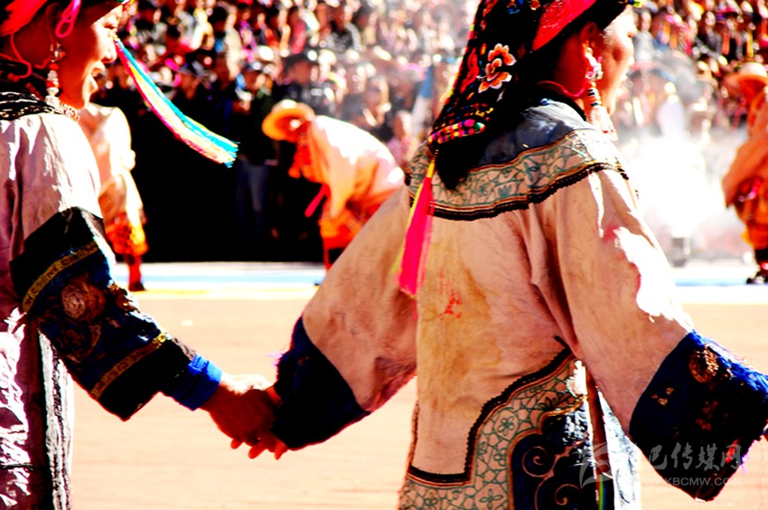 在婦女面前,腰部以下直達(dá)腳踝處,有寬約二十厘米左右的條狀絲綢布料,藏語(yǔ)稱為“仲巴”。這一條狀服飾,面料全部用絲織品制作而成。上面的圖案多為牡丹、杏花等花卉,也有龍虎、麒麟、雙龍、鳳凰等圖案的。裙擺外沿用絲織品鎖邊,絲織品上多有云紋,也有鮮花刺繡。顏色的搭配較為鮮艷,與中間的主題圖案之間形成一種強(qiáng)烈的對(duì)比,讓服飾之間的主次一目了然。