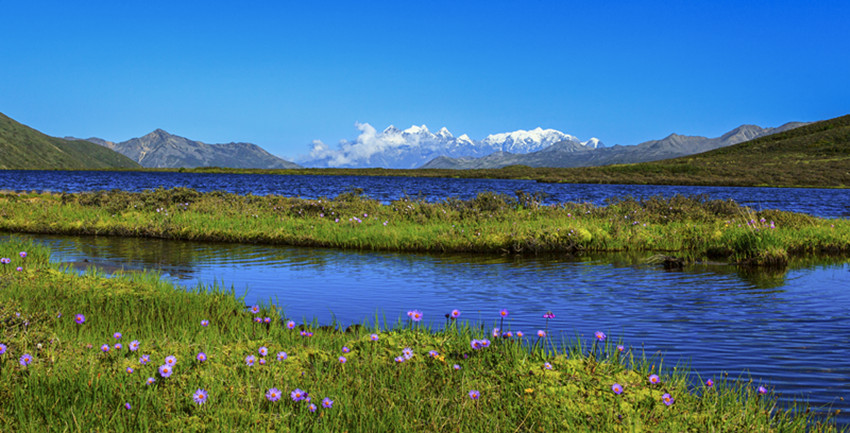 在山谷中穿行十余公里,路面一點點抬起,上了貢嘎山脈,徑直進(jìn)入康定情歌景區(qū)。隨著海拔的升高,涼意漸濃。山依舊是主角,地勢卻變得平緩而開闊,有茵茵的草地,有大小湖泊,沿途山泉潺潺,野花點綴,空氣清幽,方才單調(diào)的褐色很快被淡忘。山體漸次出現(xiàn)密集而低矮的灌木,枝條筆直地立著,有高寒山區(qū)的凜然之氣。灌木一層層上延,樹木雜多,大片的原始森林漫過山體,將大山包裹起來。遠(yuǎn)處,藍(lán)天白云之下,貢嘎雪山在群峰中探出頭來,擦亮高空的陽光。澄明的空氣里,仿佛可以聽見雪??┛┑匦?。剎那間,仿佛所有的大山,都開始舒展筋骨。