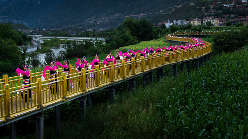 太陽落山的時候,關(guān)帝廟的漢族人和家屬意猶未盡,大唱川劇、滇劇、秦腔等。身著長袖綢衫、無領(lǐng)坎肩美麗的藏族女子,拉上小伙兒跳起巴塘弦子。載歌載舞的巴塘弦子,風(fēng)靡整個涉藏地區(qū),成為藏民族文化藝術(shù)寶庫中的一朵奇葩。