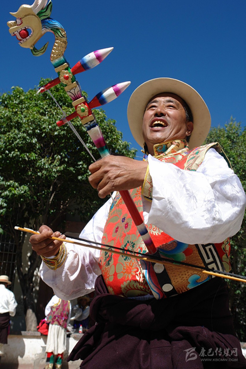 八歲時(shí),就從外婆那里學(xué)會(huì)了拉“胡幾”,拉得不好,鄰居們笑:“咿咿呀呀的,像驢子在叫”。人們?cè)谔镩g地角跳弦子時(shí),他夾在圈子里“臊堂子”調(diào)皮,后來(lái)便跟著大人跳,跳著跳著就學(xué)會(huì)了。有些動(dòng)作不標(biāo)準(zhǔn),外婆和母親就會(huì)笑著糾正。1972年,縣上的“毛澤東思想文藝宣傳隊(duì)”選中了剛滿十四歲的他,在“文革”中后期鋪天蓋地的運(yùn)動(dòng)中,他們上山下鄉(xiāng)進(jìn)軍營(yíng)送文化,弦子舞技得到強(qiáng)化,藏二胡就是在這期間越拉越好的。那時(shí)候糧食還沒(méi)有過(guò)關(guān),公社分配的工分又重,家里的日子過(guò)得很艱難。經(jīng)常跟宣傳隊(duì)唱唱跳跳,可以不做那些繁重的農(nóng)活了,他還暗地里偷偷慶幸過(guò)?!拔母铩苯Y(jié)束后,縣上成立了業(yè)余弦子隊(duì),他自然也在其中,這時(shí),他已經(jīng)能記住二百多首弦子詞曲了。西藏恢復(fù)雪頓節(jié)那年,應(yīng)該是1986年吧,他們又跳到了圣地拉薩,受到了西藏各地官員和群眾的歡迎。客居拉薩的巴塘人在雪頓節(jié)盛典上看到巴塘弦子,流下了激動(dòng)的淚水,很多人過(guò)來(lái)跟他們“打招呼”,問(wèn)候家鄉(xiāng)人。跳弦子五十多年,去拉薩應(yīng)該是最難忘的事情了?!鞍桌瓫_!說(shuō)拉薩道拉薩,拉薩建在海面上?!边@是小時(shí)候外婆教他唱的。和所有的藏族一樣,他從小就向往那塊圣地。八十年代交通極其不方便,去成都都要走整整四天,去拉薩多難啊,所以村里人都很羨慕他們弦子隊(duì)。他還記得,在向布達(dá)拉宮虔身朝拜的那一刻,他流下了感動(dòng)和幸福的淚水。