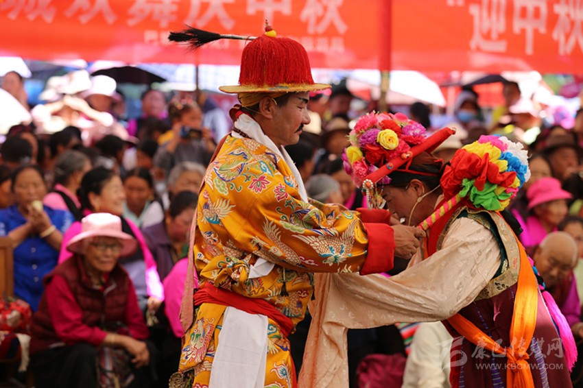 九月,龍王塘,藏戲《嘎拉旺布》演出現(xiàn)場。西繞反串花仙卓瓦桑姆,他頭戴花冠,頂上的三叉“巴珠”(后藏女人的一種頭飾)上插滿了粉色和紅色的絹花。身上穿著各色綢緞拼制成的無袖藏袍“拉姆切”,上套無袖彩條花氆氌帶和藍綠花緞帶連綴成的褂子。踩著鼓與鈸敲擊出的節(jié)奏,他的兩只腳進、頓、點、退,舞步輕盈,手腕跟隨節(jié)奏,以頭部和肩部為限,左舞右蹈,用肢體語言表現(xiàn)人物的思想感情,這是該劇第一幕《定情月下》:湖畔仙景,卓瓦桑姆偕眾仙女婆娑起舞。國王隨仙鹿而來,向卓瓦桑姆傾訴衷情,花仙為國王的真情所動,愿永結(jié)同心。仙翁降臨贈箭祝福,二人辭別眾仙……。炎炎烈日下,西繞薄施脂粉的面頰已被幾行汗水弄花,但他不以為意,此時此刻,他不是西繞,而是花仙卓瓦桑姆。從進場伊始,他便與角色融為一體。周遭的觀眾認(rèn)真觀看、解讀,現(xiàn)場一片和諧,最美的時光在這一刻被盡情雕刻。