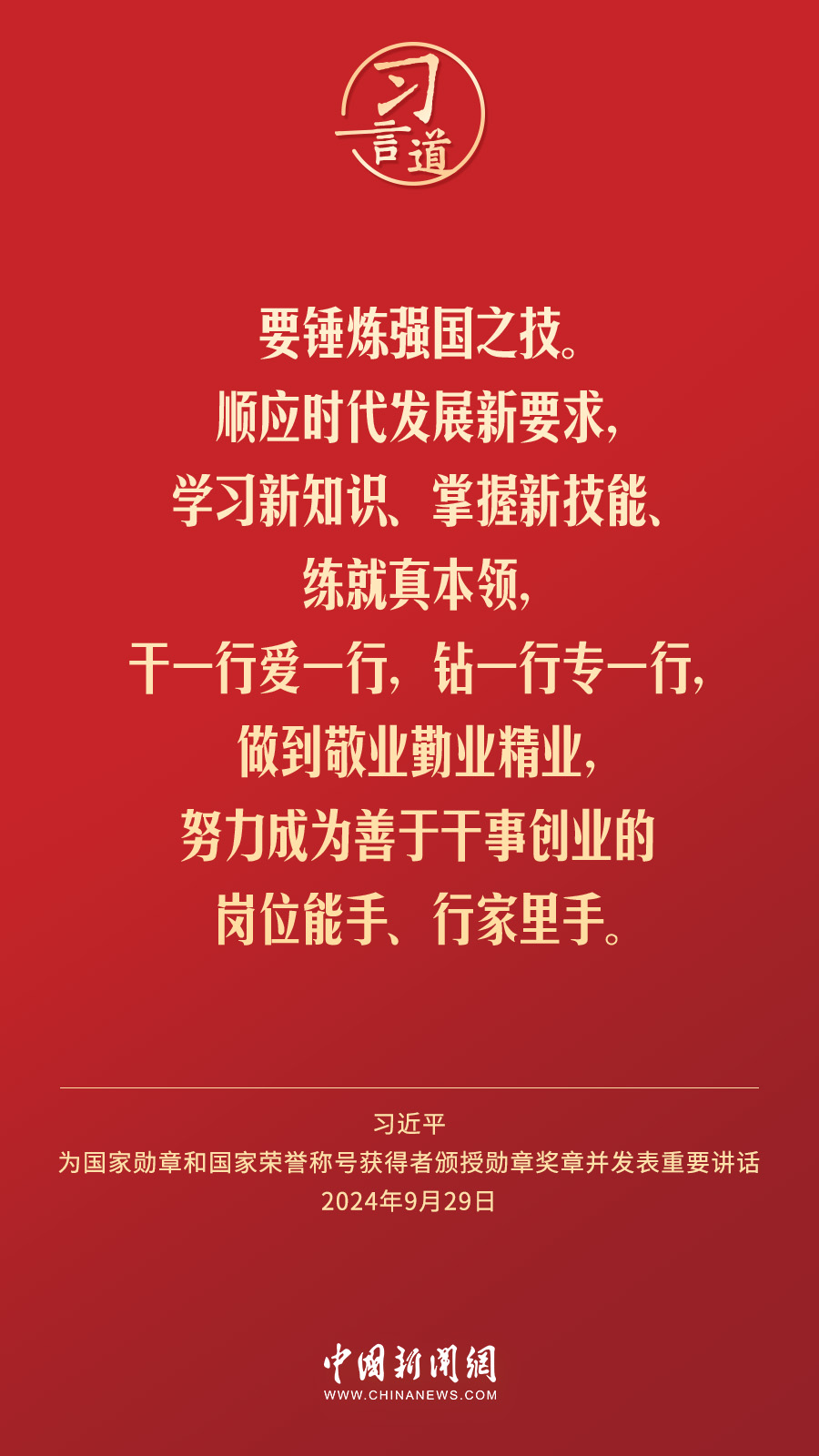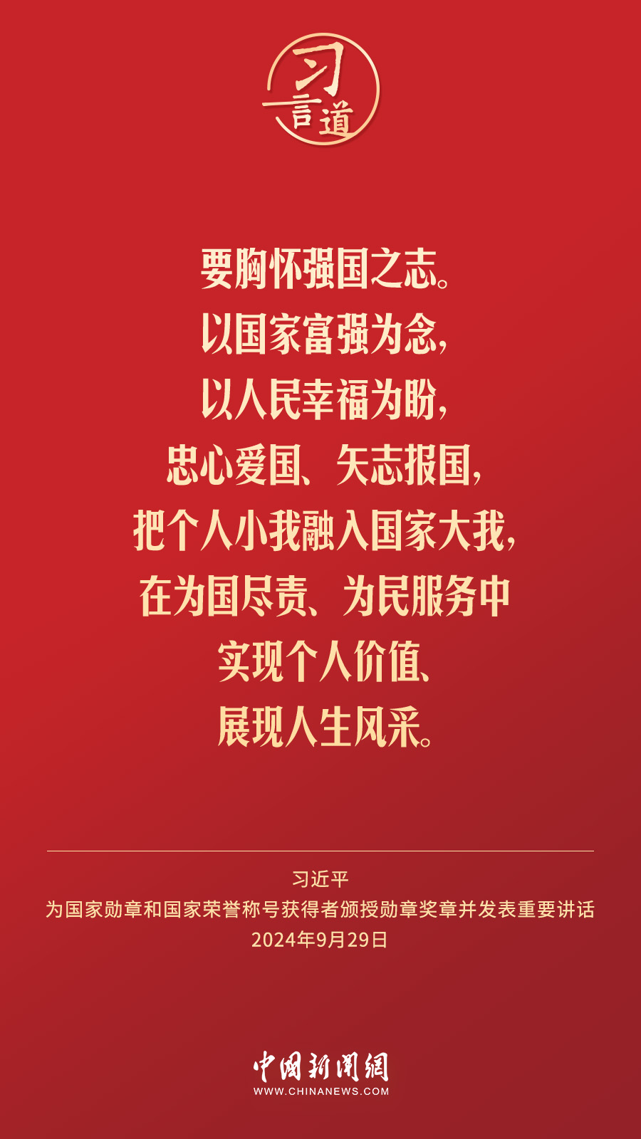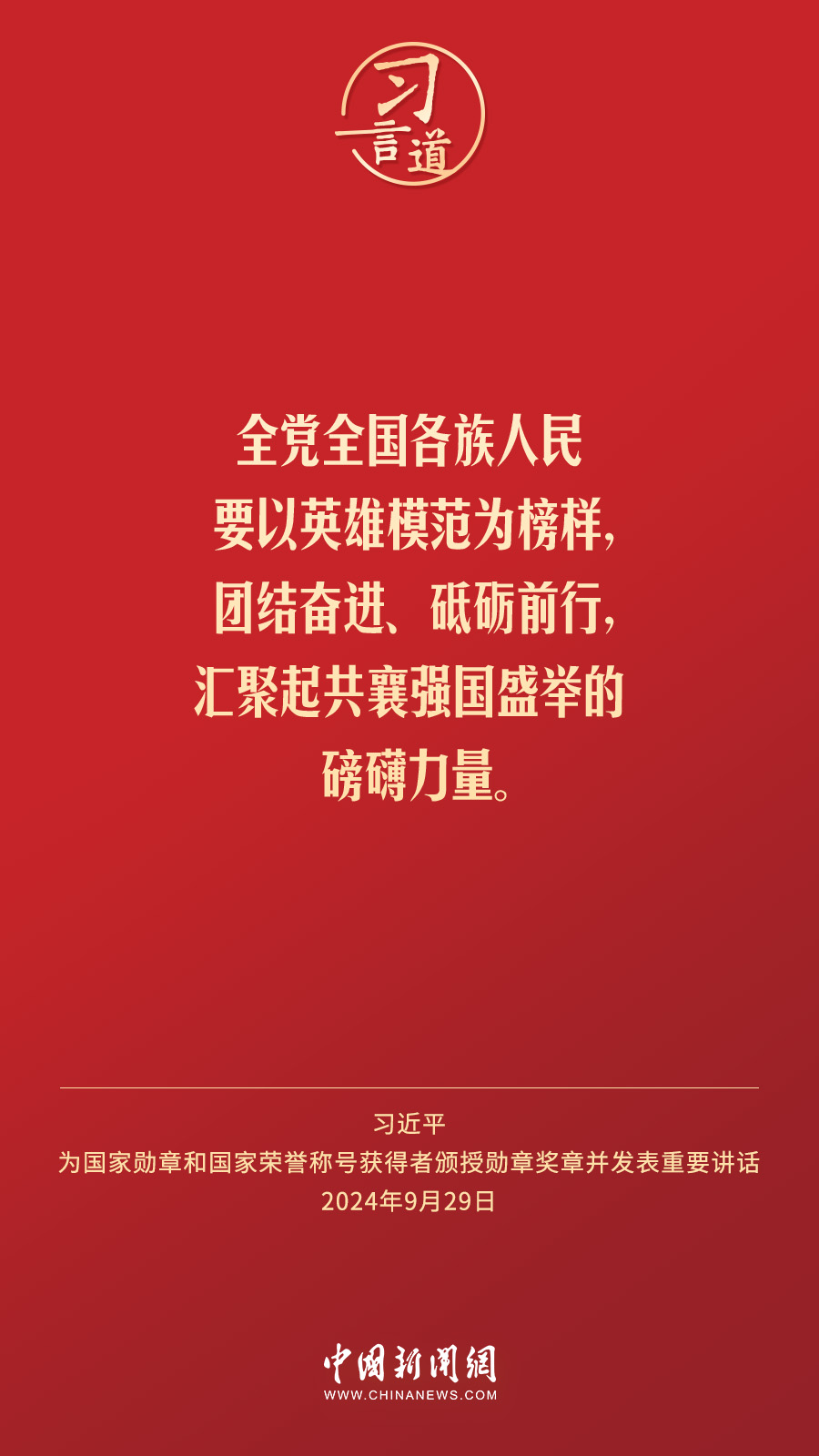 經(jīng)中共中央批準,中華人民共和國國家勛章和國家榮譽稱號頒授儀式于9月29日上午10時在人民大會堂隆重舉行。中共中央總書記、國家主席、中央軍委主席習近平向國家勛章和國家榮譽稱號獲得者分別授予“共和國勛章”“友誼勛章”和國家榮譽稱號獎章并發(fā)表重要講話。習近平指出——
