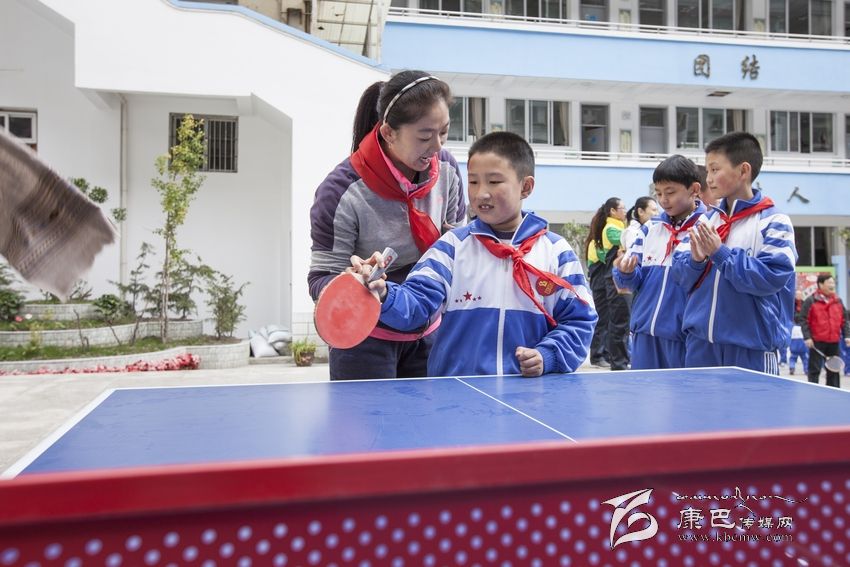 乒乓球冠軍牛劍鋒手把手教東大街小學學生打球。
