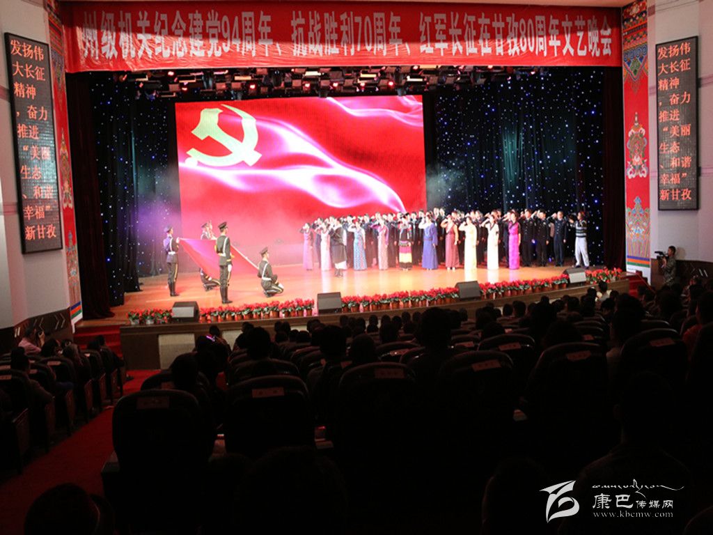 本網(wǎng)訊(記者 宋志勇 文/圖)6月30日晚,由州直屬機(jī)關(guān)工委和州民族干部學(xué)校聯(lián)合主辦的州級(jí)機(jī)關(guān)紀(jì)念建黨94周年、抗戰(zhàn)勝利70周年、紅軍長征在甘孜80周年文藝晚會(huì)在康定劇場演出。州領(lǐng)導(dǎo)李康、相洛、白蘇英、何飚、周冬秀、蔣秀英、孫飛以及甘孜軍分區(qū)領(lǐng)導(dǎo)等觀看了演出。