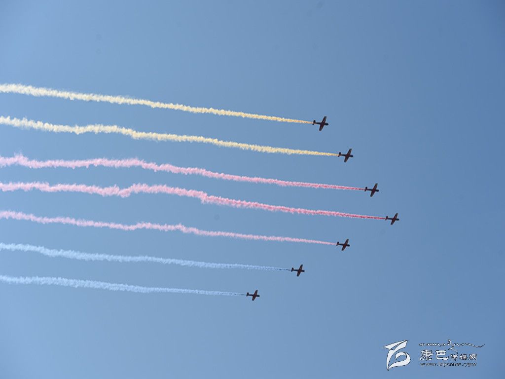 ?。返啦薀?、8道彩煙……絢麗濃艷的彩煙帶成為空中的“吸睛”亮點(diǎn)。