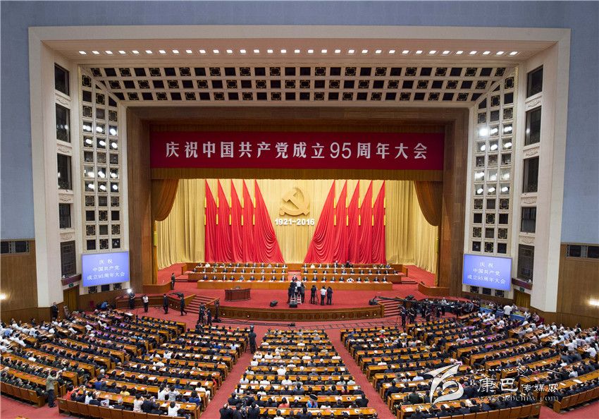 人民大會堂雄偉莊嚴(yán),萬人大禮堂燈火輝煌。主席臺上方懸掛著“慶祝中國共產(chǎn)黨成立95周年大會”會標(biāo)。帷幕正中,由鐮刀和錘頭組成的中國共產(chǎn)黨黨徽在十面紅旗映襯下熠熠生輝,“1921-2016”字樣格外醒目。大禮堂二層眺臺懸掛橫幅:緊密團結(jié)在以習(xí)近平同志為總書記的黨中央周圍,銳意進取、開拓創(chuàng)新,全面推進黨的建設(shè)新的偉大工程,為實現(xiàn)“兩個一百年”奮斗目標(biāo)、實現(xiàn)中華民族偉大復(fù)興的中國夢而努力奮斗!