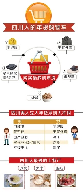 還有幾天就過(guò)年了,你們家買了哪些年貨?近日,電商平臺(tái)阿里巴巴和京東先后推出了年貨大數(shù)據(jù)。從這些數(shù)據(jù)中,我們能看到一個(gè)典型成都人的年貨網(wǎng)絡(luò)購(gòu)物車是這樣的:購(gòu)買最多的年貨還是衣服,其中羽絨服、毛呢外套是成都人的最愛(ài);家電和電子產(chǎn)品愛(ài)買空氣凈化設(shè)備和玫瑰金iPhone7手機(jī);食品是山核桃等炒貨,以及國(guó)產(chǎn)白酒。在女性偏好酒水消費(fèi)的排名中,四川女性排名第五。