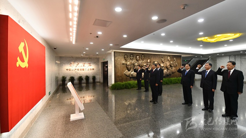 紀(jì)念館圓形序廳里,精美的紅船雕塑栩栩如生,碩大的鐮刀錘頭圖案鮮艷奪目,二者交相輝映,寓意中國(guó)共產(chǎn)黨領(lǐng)航中國(guó)號(hào)巨輪破浪前行。習(xí)近平等由此進(jìn)入以“開天辟地”為主題的展廳,先后參觀了“探索救亡圖存道路”、“中國(guó)共產(chǎn)黨成立”等專題展覽。這里展出的實(shí)物和圖片,同上海中共一大會(huì)址的展覽互為印證,詳實(shí)記錄了中國(guó)共產(chǎn)黨誕生的歷史全貌。習(xí)近平不時(shí)同其他常委同志交流。習(xí)近平表示,從紀(jì)念館奠基那一刻起,我就一直想著落成后要來看一看,今天如愿以償了,確實(shí)深受教育和鼓舞。在浙江工作期間,我曾經(jīng)把“紅船精神”概括為開天辟地、敢為人先的首創(chuàng)精神,堅(jiān)定理想、百折不撓的奮斗精神,立黨為公、忠誠為民的奉獻(xiàn)精神。我們要結(jié)合時(shí)代特點(diǎn)大力弘揚(yáng)“紅船精神”。