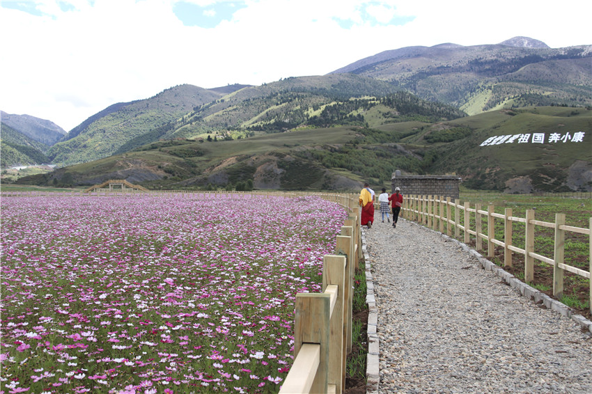去年,在我州理塘縣濯桑鄉(xiāng)漢戈村, 當?shù)貭幦「鞣劫Y金,利用旅游區(qū)位優(yōu)勢和老百姓群策群力,打造了占地800多畝、以波斯菊為主的漢戈花海,配套修建了賽馬場、游客中心、鍋莊廣場等。從去年國慶開始,漢戈花村開門迎客,鮮花留住了游客,也留住了收入。