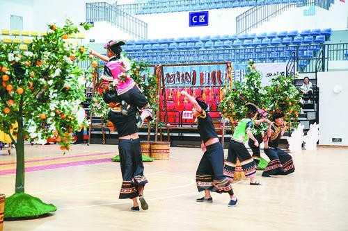 雅安市代表團教練李鏡文告訴記者,《石炯諧博》表演項目依托當?shù)匾图颐袼?,在黃果柑豐收的季節(jié),石棉縣彝族小伙、姑娘們在果林里采摘黃果柑時所產(chǎn)生的勞動趣味競技活動的演繹,反映了少數(shù)民族地區(qū)經(jīng)濟發(fā)展、社會繁榮穩(wěn)定、各族人民安居樂業(yè)的生活和精神風(fēng)貌。