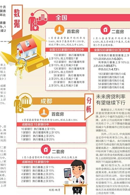 其中,上海首套房貸利率較上月持平仍為最低,成都首套房貸利率平均值為5.69%,環(huán)比上漲0.35%。分析師認為,1月利率下調銀行數量較上月減少,首套平均利率出現連續(xù)2個月下降,未來利率整體繼續(xù)回落的可能性較大。