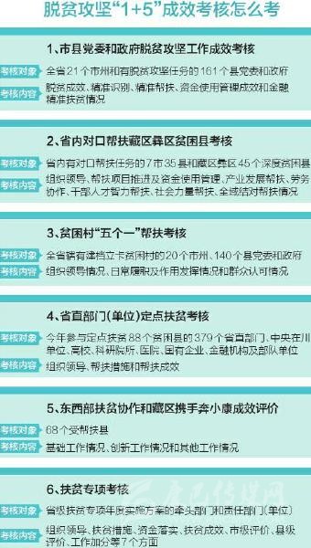 如何考?省扶貧開發(fā)局相關(guān)負(fù)責(zé)人介紹,具體而言,就是將黨委和政府脫貧攻堅(jiān)工作成效考核、省直部門(單位)定點(diǎn)扶貧考核、扶貧專項(xiàng)考核、省內(nèi)對口幫扶藏區(qū)彝區(qū)貧困縣考核、貧困村“五個一”幫扶考核、東西部扶貧協(xié)作和藏區(qū)攜手奔小康成效評價統(tǒng)一整合為脫貧攻堅(jiān)成效考核,一支隊(duì)伍完成所有考核。