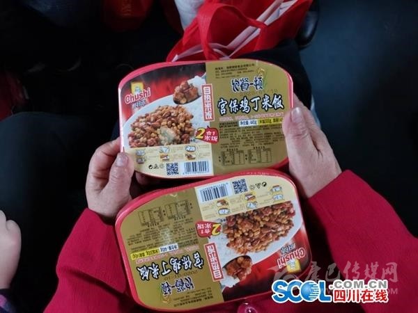 18日中午12時, 列車出發(fā)2小時后,巴中恩陽人鄔兵領(lǐng)到了來自家鄉(xiāng)的午餐——一盒自熱米飯,配菜是宮保雞丁。“不錯不錯,今年不用吃方便面了?!倍松厦罪埖泥w兵笑了笑。