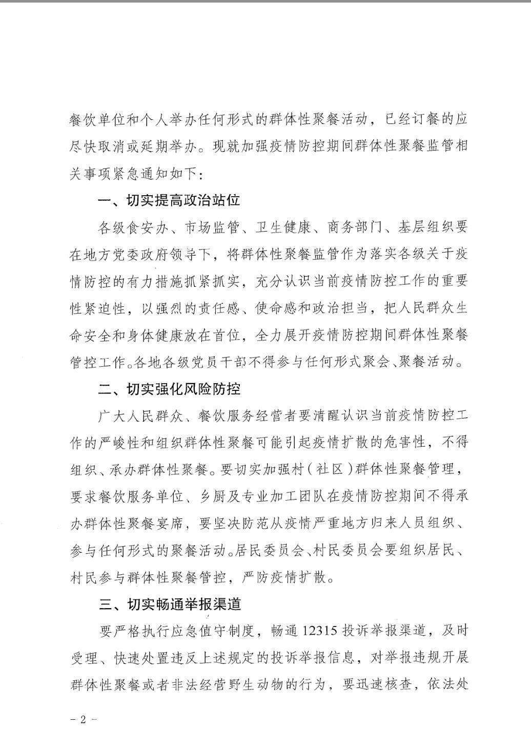 各級(jí)食安辦、市場監(jiān)管、衛(wèi)生健康、商務(wù)部門、基層組織要在地方黨委政府領(lǐng)導(dǎo)下,將群體性聚餐監(jiān)管作為落實(shí)各級(jí)關(guān)于疫情防控的有力措施抓緊抓實(shí),充分認(rèn)識(shí)當(dāng)前疫情防控工作的重要性緊迫性,以強(qiáng)烈的責(zé)任感、使命感和政治擔(dān)當(dāng),把人民群眾生命安全和身體健康放在首位,全力展開疫情防控期間群體性聚餐管控工作。各地各級(jí)黨員干部不得參與任何形式聚會(huì)、聚餐活動(dòng)。