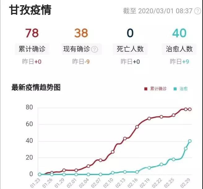 截至2月29日24時,我州累計報告確診病例78例,累計治愈出院40人(道孚縣35人、康定市2人、色達縣2人、稻城縣1人),其余38人(重癥4例,危重癥1例)均在定點醫(yī)院隔離治療,231名密切接觸者正在接受醫(yī)學觀察。我州除道孚縣“五鄉(xiāng)一鎮(zhèn)”外,其余17個縣(市)連續(xù)26天無確診病例報告。