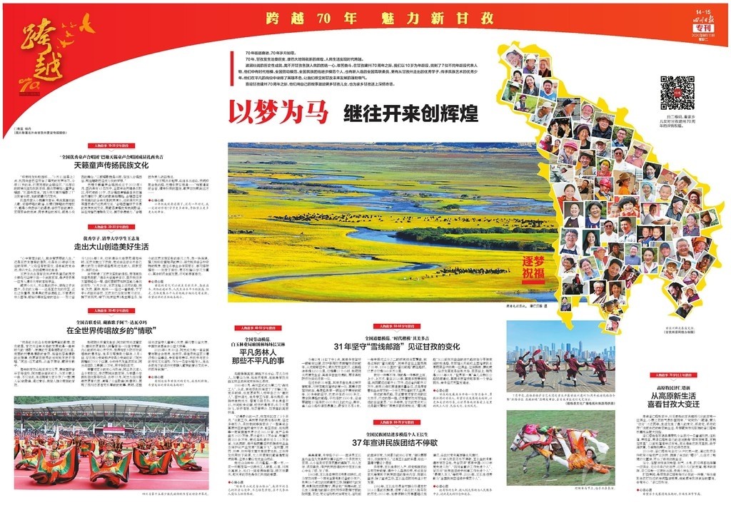 開篇連版以手繪甘孜建州70周年10件大事記鋪底,部分金山、碉樓等民族元素做點綴。版面上有州委州政府的署名文章,還有川報首席記者所寫《光輝歲月 砥礪奮進》70年綜述,并鏈接二維碼,可通過手機掃碼看甘孜70年變遷。